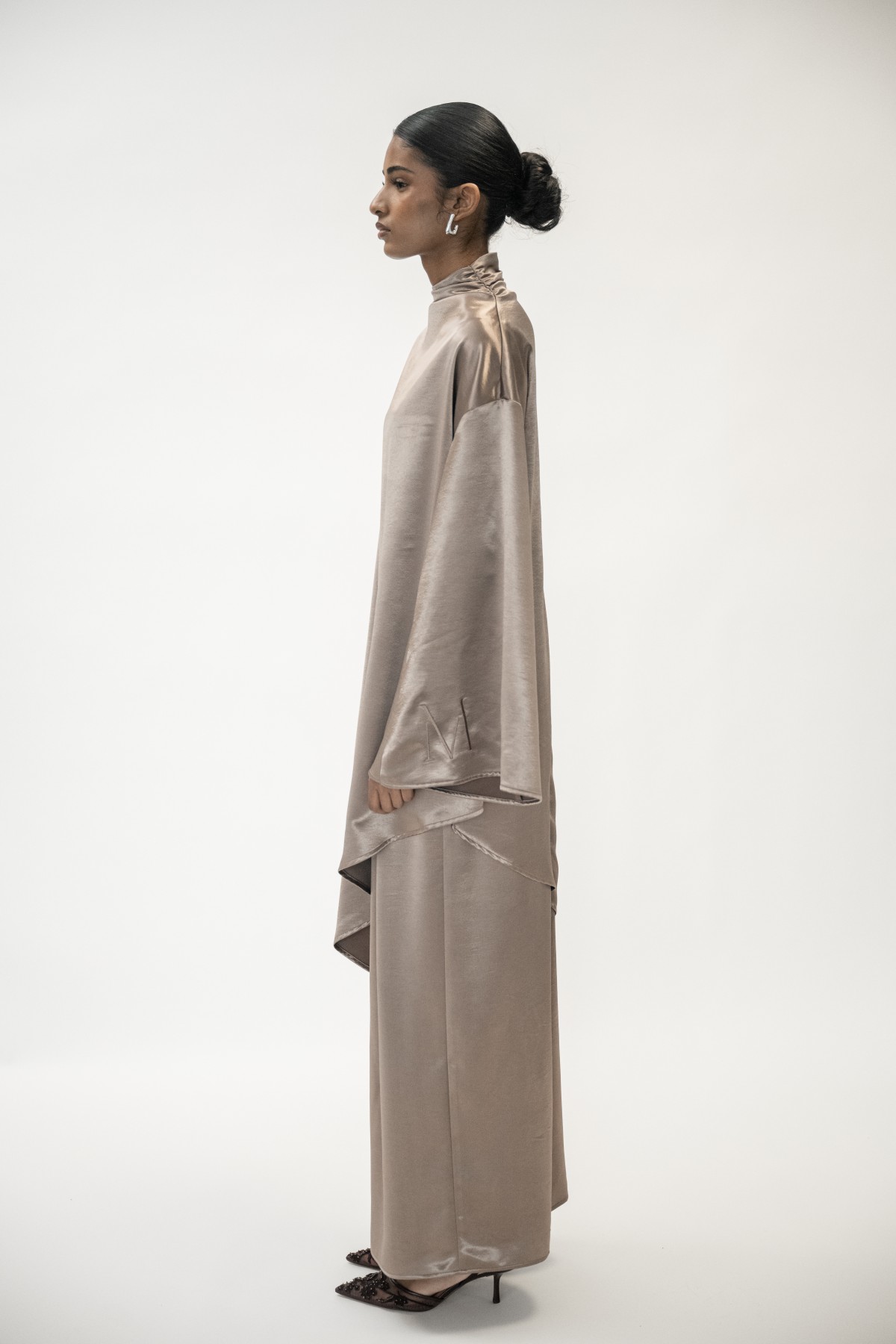 This refined two-piece set embodies understated luxury with a modern silhouette. Crafted from fluid high-quality Italian satin, the fabric drapes effortlessly over the body, creating a soft shine and elegant movement with every step. The design blends structure and flow, making it perfect for both elevated everyday wear and sophisticated occasions.